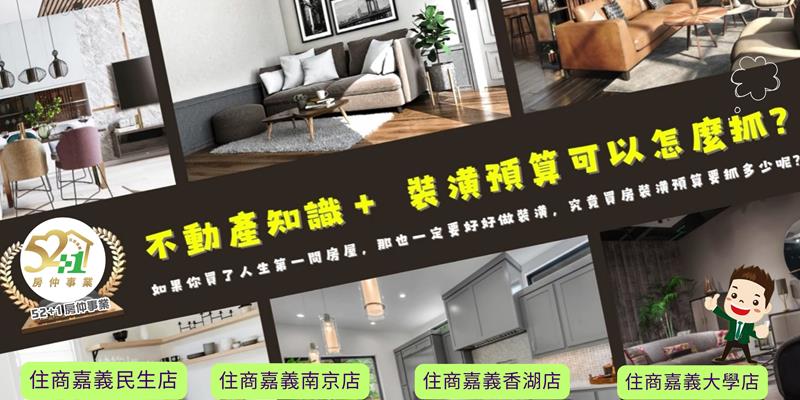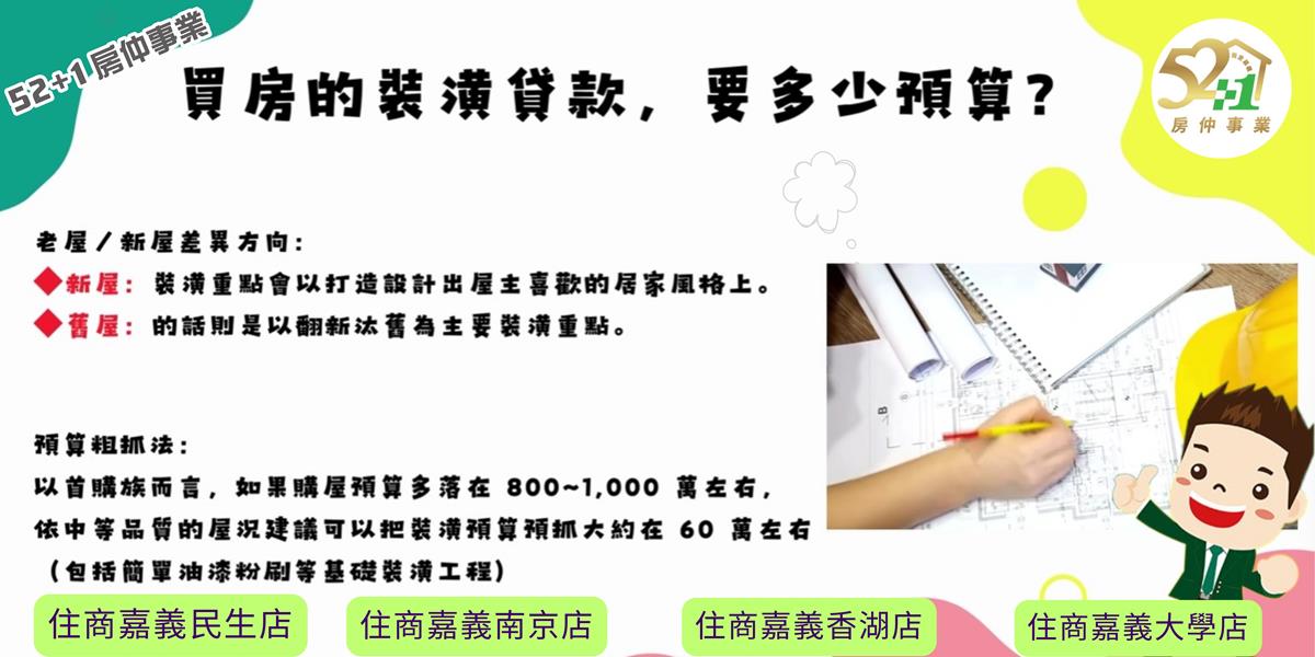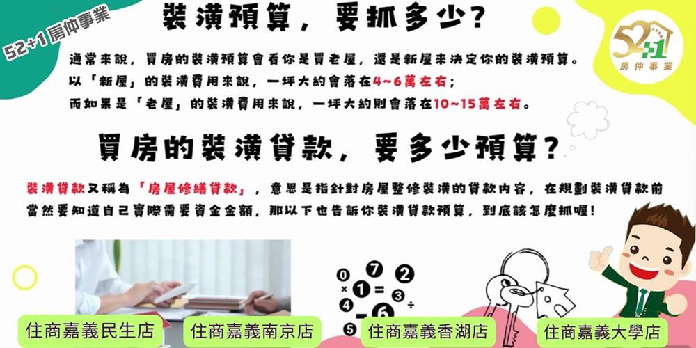 請問....裝潢預算要抓多少❓😊現煮食佇遮講乎你知😊 【住商嘉義52+1房仲事業團隊】幫你搞懂房屋裝潢貸款的預算,瞭解自己實際需要的資金金額,讓你也可以更加清楚該如何規劃裝潢資金!把錢花在刀口上,開心入主您理想中的裝潢美屋!讓我們來看看如何粗抓預算吧!關於更多細節歡迎洽詢【住商嘉義52+1房仲事業團隊】!✅不動產委買委賣代理✅房地產市場行情查詢✅不動產銀行貸款預估✅房地產稅務免費諮詢........................................................................【信實仲介,永續服務】我們是ㄧ群有共通信念的團隊從總部到店頭從店頭到人員只想做好每一件客戶交付的任務無論您要買房或者有資產要出售請洽詢:嘉義住商不動產52+1團隊.一家委託四家直營強力廣告.18家品牌近400位經紀人員流通銷售..👍 想找更多新房訊及優秀的經紀人員或者物件👍 請上52+1官網 : https://52cyi.com.tw/#住商嘉義民生店🌳元亨利地產經紀有限公司☎️05-2852200🏠嘉義市杭州三街23號.#住商嘉義南京店🌳允霖房屋經紀有限公司☎️05-2862200🏠嘉義市南京路582號.#住商嘉義香湖店🌳創業家地產有限公司☎️05-2346777🏠嘉義市文化路471號. #住商嘉義大學店🌳誠交不動產經紀有限公司☎️05-2861000🏠嘉義市世賢路四段96號