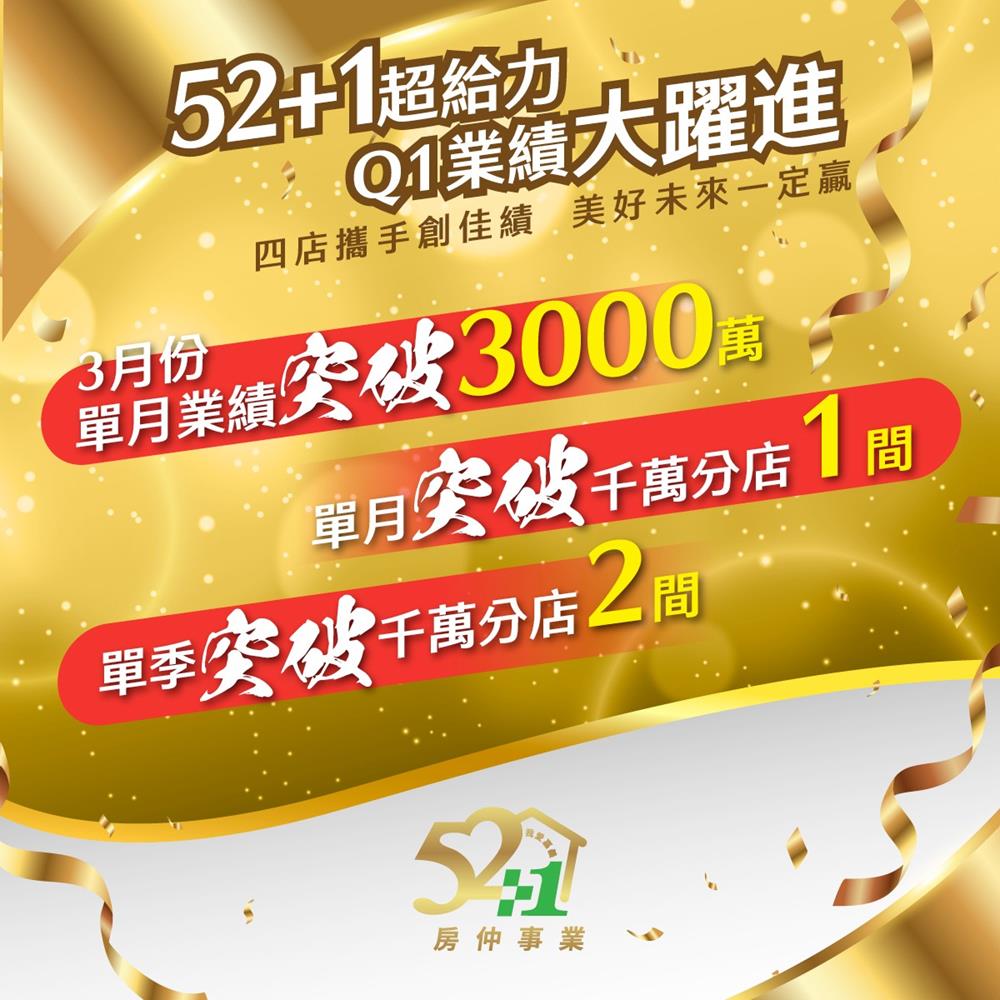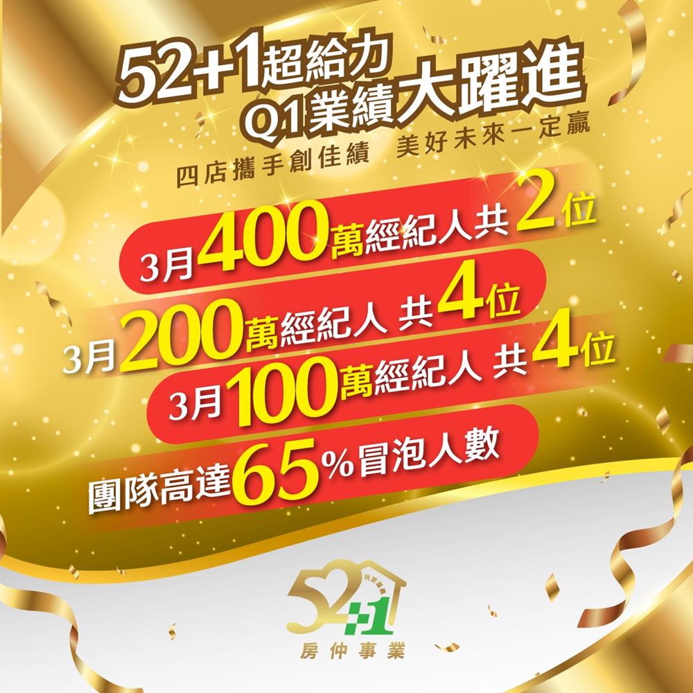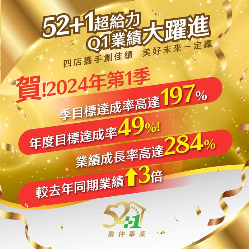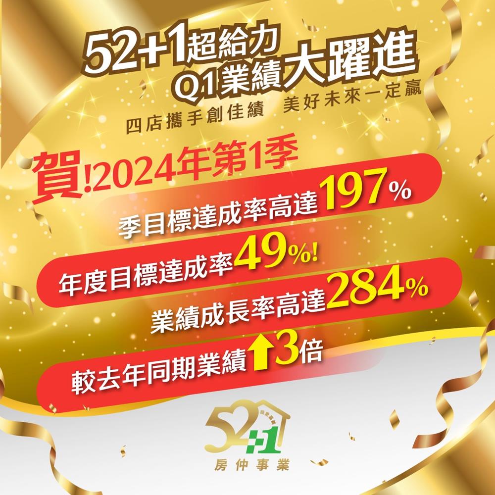 Q1業績大躍進🚀四店攜手創佳績🫶 美好未來一定贏💪══════════各位親愛的好朋友,承蒙大家一直以來對 #52+1團隊 的支持與鼓勵,今天很開心要和大家分享我們在2024年第一季,攜手創下感動又驕傲的榮耀紀錄🏆🏆🏆不論團隊目標、各分店達成與業務個人績效,都有高水準的表現,證明了 #52+1團隊 4店合作讓房仲資源產生最大的效益,更說明了在 #52+1團隊 的房仲業務,個個都有備受肯定的堅強實力💎.令人驕傲的好成績,在夥伴們每日紮實的業務行程中奠基;令人感動的好業績,從客戶們每次真心的服務回饋裡累積。感謝每位 52+1 的業務夥伴,您的每一分努力,都為團隊帶來最有價值的成果;感謝每位 52+1 的買賣雙方,您的每一次肯定,都讓我們產生持續前進的動力。.🚩52+1 深耕嘉義,四店聯賣的專業房仲平台,豐富多元的數位行銷資源,讓不動產買賣的成交機會再+1!🚩歡迎所有對房仲事業有興趣的優秀人才,加入 #52+1團隊~【你是人才,我有舞台】~期待在未來的日子,我們能作伙攜手前行,為所有在嘉義尋家的人,圓滿成家的夢想🌈══════════【🎉🎉🎉52+1 我愛嘉義 |榮耀時刻 感恩有您🎉🎉🎉】🏆賀🏆2024年第1季 #52+1團隊 🎯季目標達成率高達197%!!!🎯年度目標達成率49%!!!🏆賀🏆2024年第1季破千萬分店~2家🎯52+1團隊業績成長率高達284%!🎯較去年同期業績成長3倍!!!🏆賀🏆2024年3月份🎯單月業績突破3000萬!🎯單月破千萬分店~1家!🎯三月破400萬經紀人~共2位!🎯三月破200萬經紀人~共4位!🎯破100萬經紀人~共4位!💢團隊有高達65%冒泡人數💢🩷我在 52+1✅等你來 +1#嘉義優質房仲 都在 https://52cyi.com.tw/?module=about&file=job#住商嘉義民生店☎️05-2852200🏠嘉義市杭州三街23號.#住商嘉義南京店☎️05-2862200🏠嘉義市南京路582號.#住商嘉義香湖店☎️05-2346777🏠嘉義市文化路471號. #住商嘉義大學店☎️05-2861000🏠嘉義市世賢路四段96號#52+1#我愛嘉義 #優質房仲 #業務菁英 #住商嘉義民生店 #住商嘉義南京店 #住商嘉義香湖店 #住商嘉義大學店 #業務招募 #房仲招募 #嘉義房仲#房仲推薦#房仲應徵#百萬房仲 #千萬經紀人